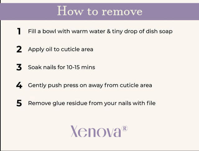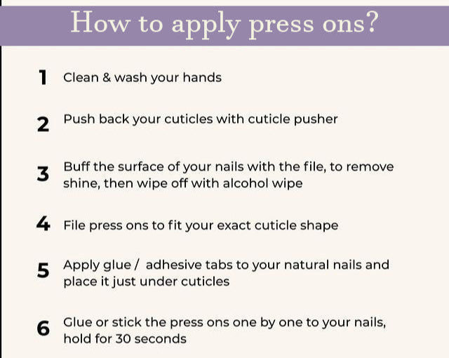 Unsere Nägel können mit dem beigefügten Kleber oder den Klebepads einfach auf den Naturnägeln angebracht werden. Eine detaillierte Schritt-für-Schritt-Anleitung liegt jeder Bestellung bei.