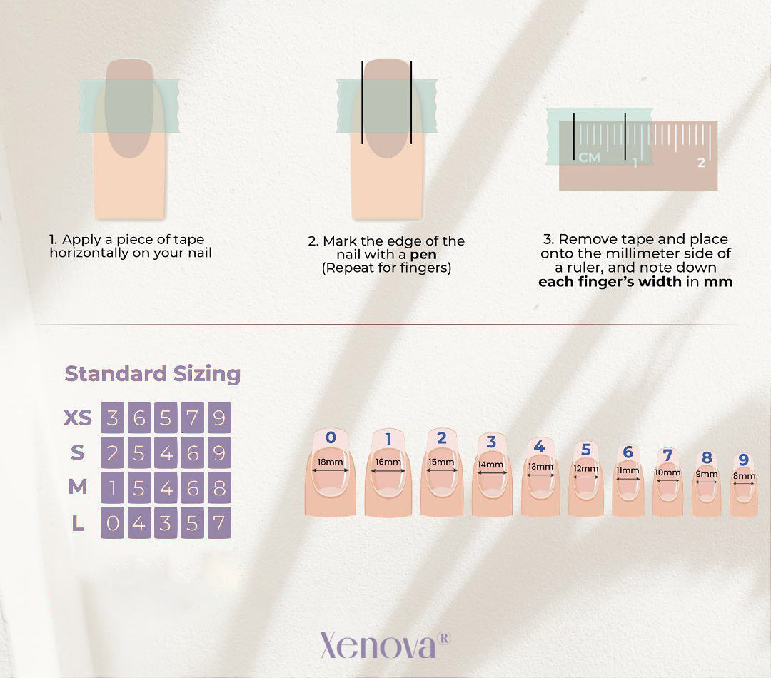Lege ein Klebeband auf den Nagel, markiere die Breite, ziehe das Band ab und messe die Markierung mit einem Lineal. Vergleiche deine Maße mit unserer Größentabelle für dein perfektes Set!